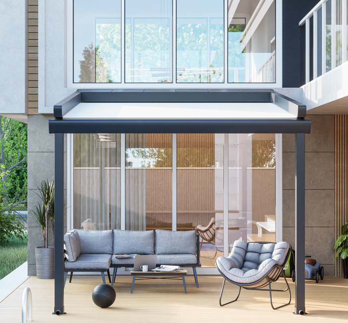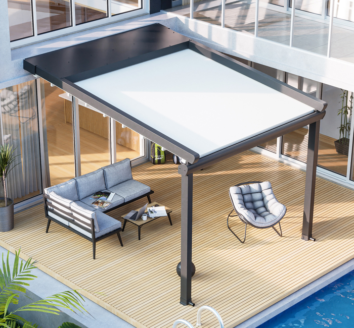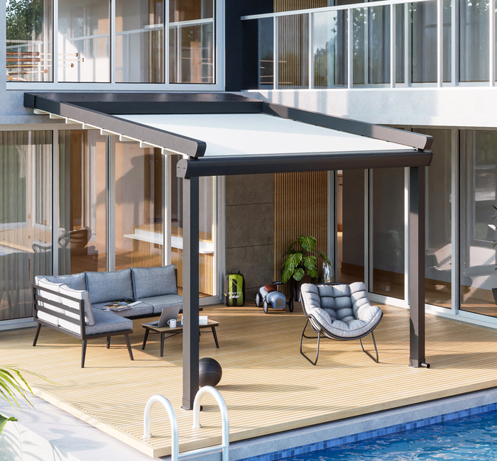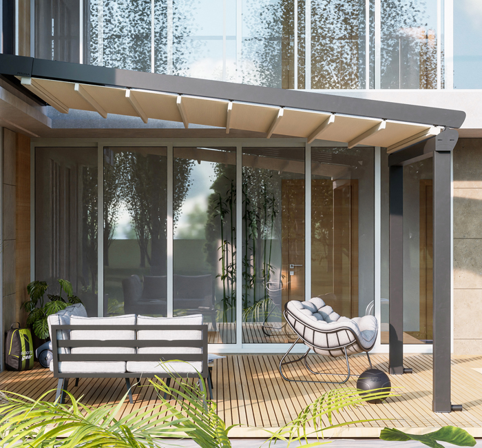 Pergola Alu Elegant è un sistema di tende da sole a pergola elegante e resistente progettato per l'uso esterno. Un'opzione funzionale e altamente efficiente della collezione Pergola Alu, è ideale per chi vuole creare uno spazio piacevole nel proprio giardino o terrazzo. Elegant è progettato per soddisfare tutte le esigenze formali e strutturali di cui potreste aver bisogno per creare il vostro spazio esterno ideale. Si tratta di un sistema pieghevole che mira a creare uno spazio confortevole e permanente per gli spazi esterni e a proteggere gli utenti dal sole, pioggia e vento. Inoltre, con le sue guide in alluminio appositamente progettate e integrate nella struttura, Pergola Alu garantisce una lunga durata nel tempo grazie al suo funzionamento silenzioso e veloce. Il sistema garantisce un'elevata protezione contro il sole, pioggia e vento grazie allo speciale tessuto frangisole, permettendo di sfruttare al meglio gli spazi esterni come giardini, balconi, patii/verande e terrazze. Il sistema di ombreggiatura Elegant può essere integrato con diversi sistemi di chiusura oppure è possibile creare un'area completamente chiusa.