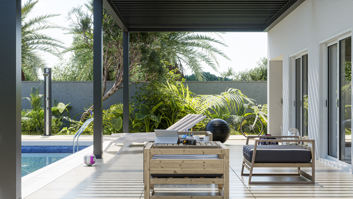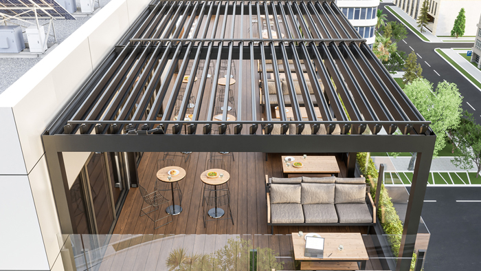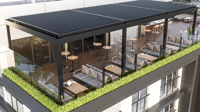 La pergola bioclimatica SkyLounge è il miglior alleato della natura per offrirvi un comfort continuo indipendentemente dalle mutevoli condizioni meteorologiche con un consumo energetico minimo. La sua caratteristica distintiva sono le feritoie regolabili della copertura superiore che ruotano quando sono parzialmente aperte, fornendo una leggera brezza e bloccando la luce solare. In posizione chiusa protegge dalla pioggia e garantisce il drenaggio dell'acqua piovana grazie ai tubi interni. Le facciate laterali possono essere chiuse per creare un effetto rinfrescante in estate, mentre è possibile installare pannelli in vetro per godere della vista in inverno. Grazie ai pannelli bioclimatici in alluminio di alta tecnologia, il comfort degli utenti è assicurato in tutte le condizioni atmosferiche. Offre protezione contro forti venti, pioggia e neve grazie alle feritoie che possono ruotare fino a 115°.