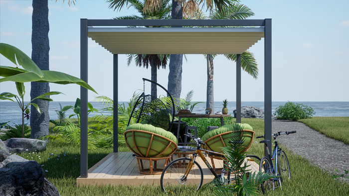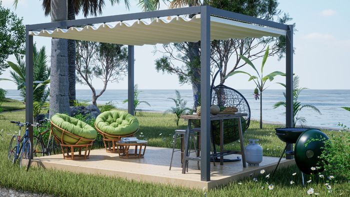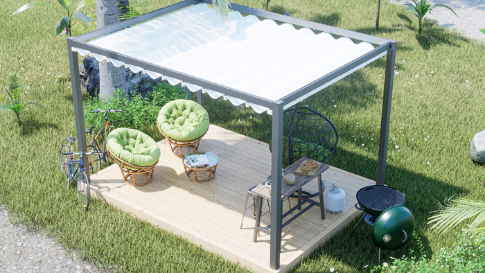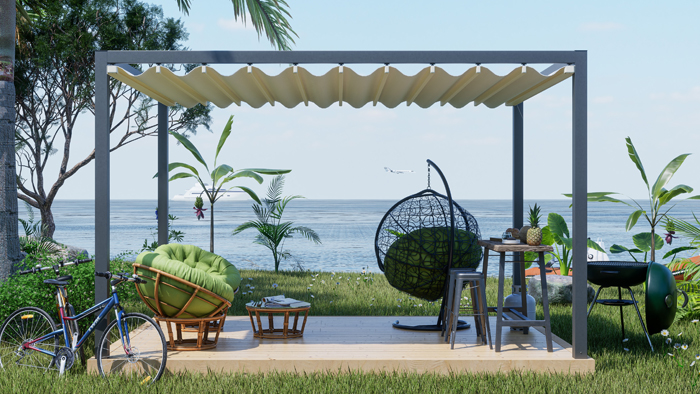 Toscana è un pratico sistema di tende da sole a pergola retrattile manualmente, progettato per l'uso esterno, che offre protezione dal sole e dalla pioggia. Grazie al tessuto in PVC impermeabile, ignifugo e ad alta resistenza, potrete godervi la vostra Toscana in qualsiasi condizione atmosferica. Toscana vi aiuta a creare uno spazio abitativo in più all'aperto, proteggendovi dal sole e dalla pioggia. L'elegante tetto scorrevole in tessuto PVC è estremamente facile da aprire e chiudere manualmente. Il suo design speciale garantisce un facile montaggio e una rapida installazione. L'impiego di alluminio e acciaio inox rende Toscana un pergolato permanente di cui potrete godere per molti anni.