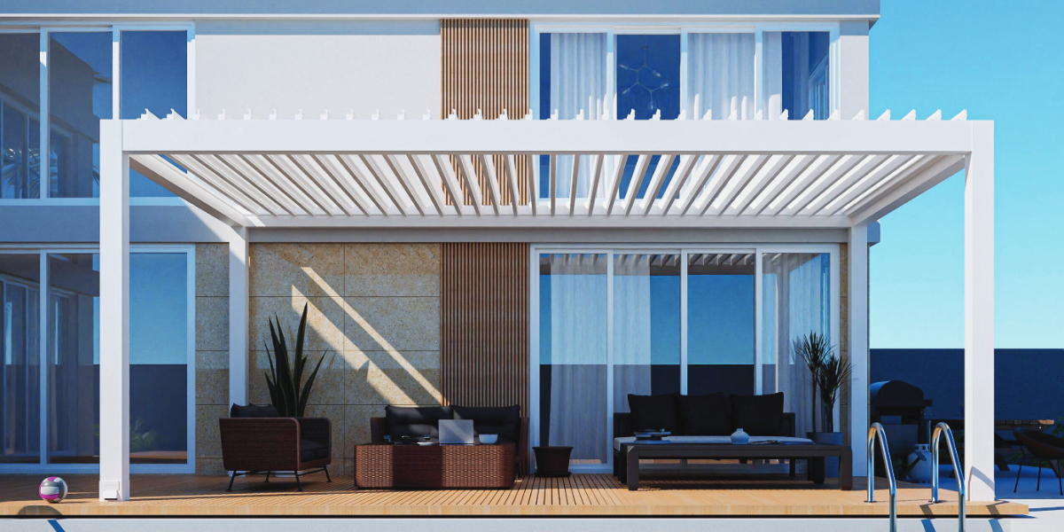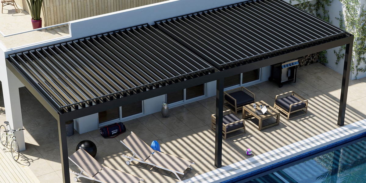 Pergola bioclimatica con lamelle retrattili in alluminio Cultura Outdoor di Nuova Generazione SkyMax utilizza lamelle intelligenti che consentono di regolare l'ombreggiatura deg...